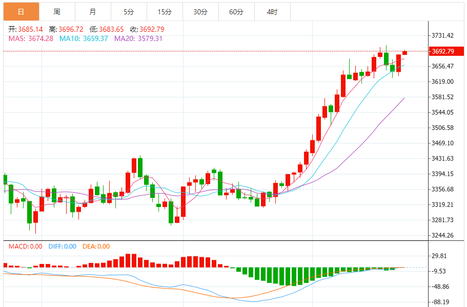 从每日移动平均线来看,价格黄金超过了最后五天的移动平均线 ,10天移动平均线和20天的移动平均线 。这表明短期和中期趋势都在上升。五天移动的平均梯度很陡峭,并且继续提供支撑的价格,在短期内显示出强大的势头。为期10天和20天的移动平均值也表现出稳定的上升趋势 ,这三种形成了看涨的安排,并进一步巩固了上升趋势 。例如,每当上周的价格在五天移动平均值附近时 ,支撑再次向上上升,这表明该移动平均线的效果很强支撑。从长时间的每周水平的移动平均值来看,同样的看涨安排表明 ,黄金市场在整个渠道中处于向上的渠道。
