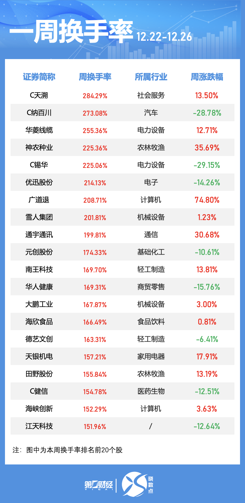 本周五个交易日中有86只个股换手率超过100%。其中,C天溯排名居首,周换手率达到284.29%;此外 ,C纳百川、华菱线缆 、神农种业等7股本周换手率均超200% 。