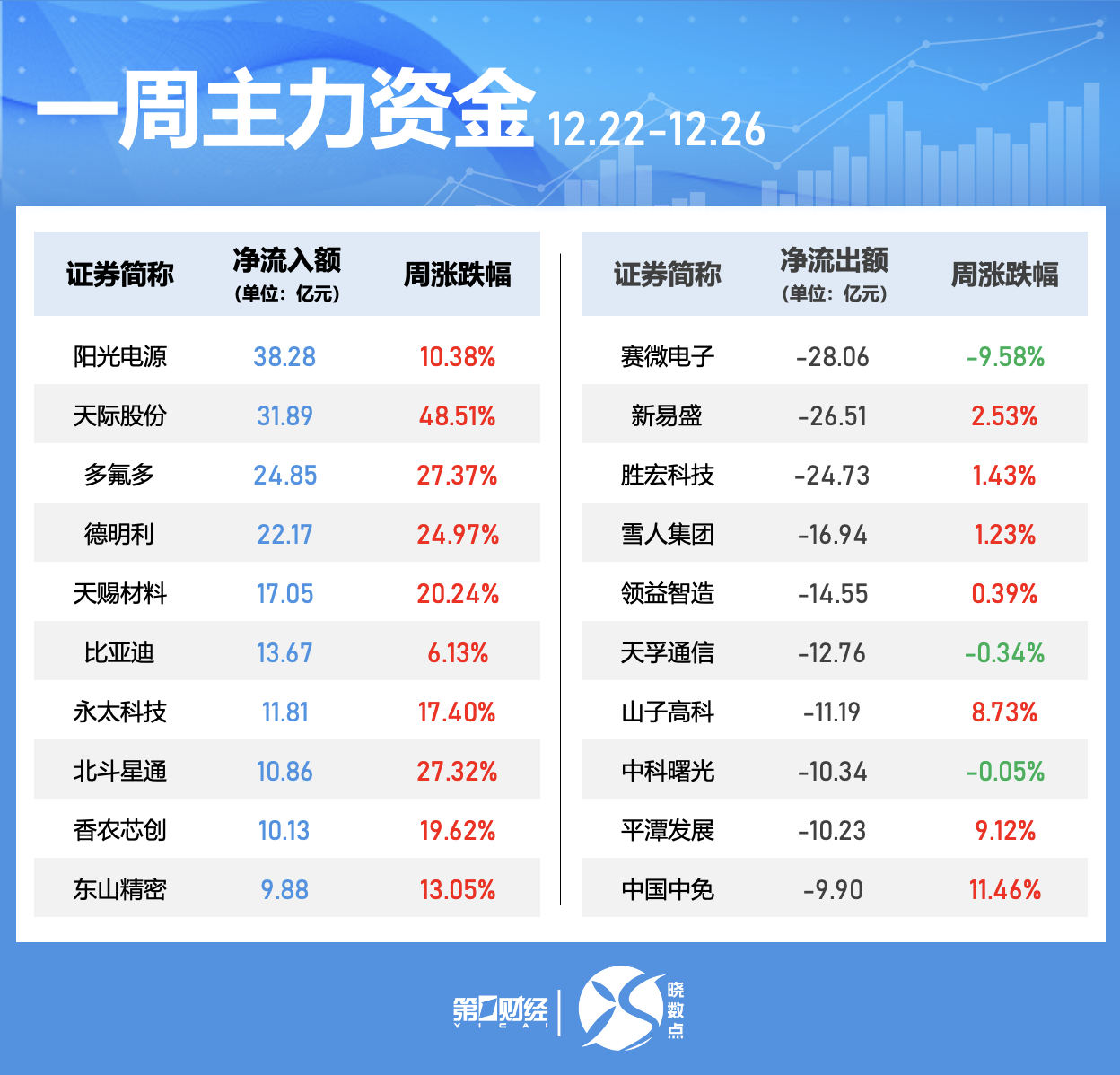 个股方面,本周阳光电源 、天际股份、多氟多获主力净流入居前 ,分别为38.28亿元、31.89亿元、24.85亿元;净流出方面,赛微电子 、新易盛、胜宏科技遭主力净流出居前,分别为28.06亿元、26.51亿元 、24.73亿元。