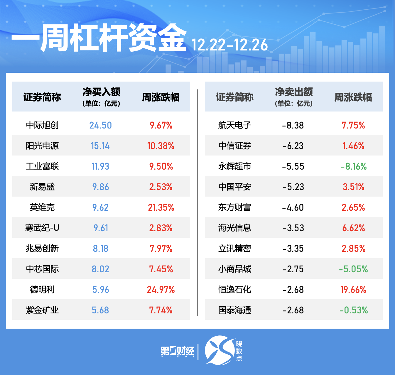 中际旭创本周获融资净买入居首,净买入额为24.50亿元 。阳光电源、工业富联、新易盛净买入额居前 ,金额分别为15.14亿元 、11.93亿元、9.86亿元;航天电子、中信证券 、永辉超市遭净卖出额居前,金额分别为8.38亿元、6.23亿元、5.55亿元。